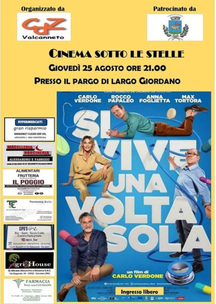 Ultimi due imperdibili appuntamenti a Valcanneto con gli eventi estivi organizzati dal Comitato di Zona insieme all’Assessorato alle Politiche Culturali del Comune di Cerveteri. In programma, una serata di cinema e una di musica. Giovedì 25 agosto alle ore 21:00, per la serie “Cinema sotto le stelle”, verrà proiettato il film di Carlo Verdone “Si vive una volta sola”, con Rocco Papaleo, Anna Foglietta e Max Tortora. Sabato 27 agosto alle ore 21:30, “Icaro” in concerto, tributo a Renato Zero. Nell’occasione, presenti anche stand di enogastronomia. Entrambe le serate sono ad ingresso gratuito.