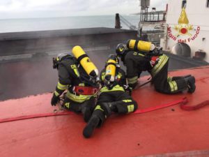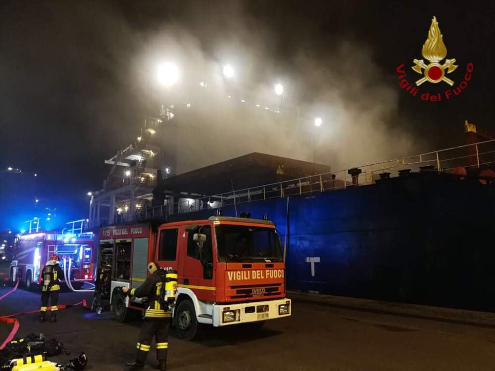 In seguito ad accordi presi sul posto fra gli enti presenti, i VVF sono saliti a bordo della nave e con l’ausilio di termocamere hanno individuato tre focolai nella stiva numero 7 dando inizio all’opera di spegnimento. Due focolai sono stati estinti in tempi brevi, mentre per quanto riguarda il terzo si stanno ultimando ora le fasi di spegnimento, a causa della difficoltà di raggiungimento dello stesso. Sul posto in ausilio è intervenuto il seguente personale VVF che ha operato con i Vigili del Fuoco di Civitavecchia: VVF di Cerveteri; il CRRC (carro rilevamento nucleare chimico biologico); il funzionario di servizio dal Comando di Roma. L’intervento dei Vigili del Fuoco ha impedito alle fiamme di propagarsi al resto della nave ed alle strutture presenti sulla banchina, scongiurando ben più gravi conseguenze ambientali.