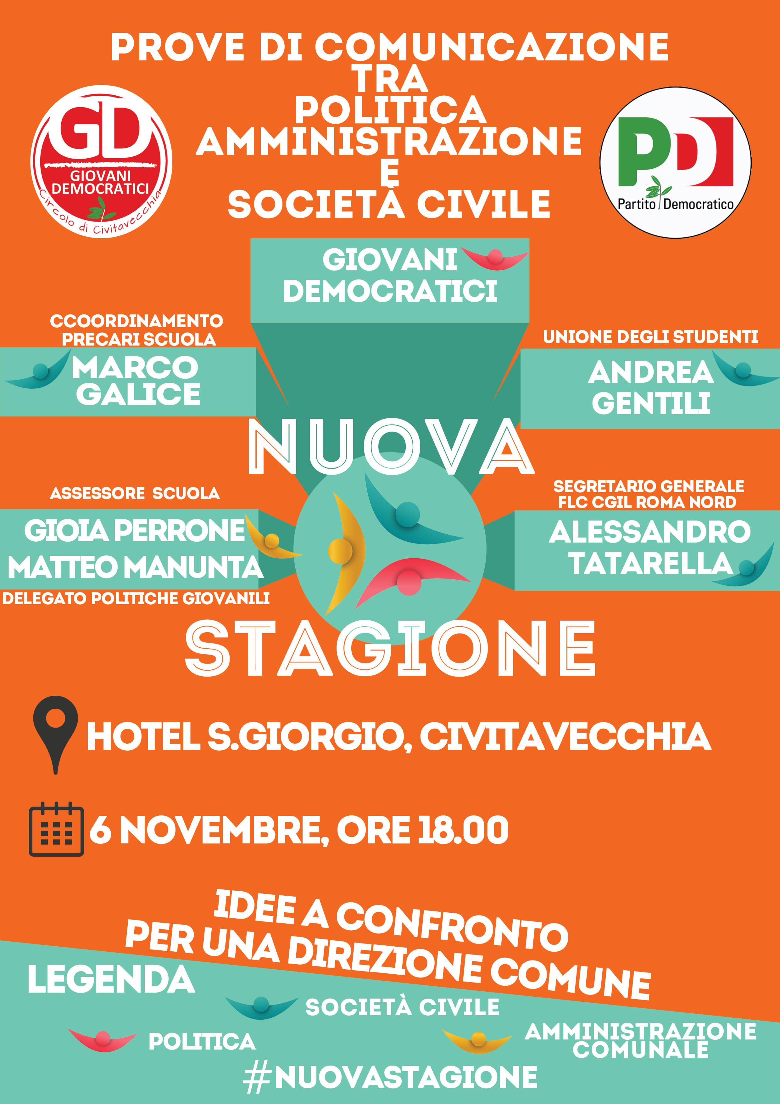 Siamo contenti dunque di poter dire che la nuova stagione è arrivata. Vi aspettiamo giovedì 6 Novembre all’Hotel San Giorgio alle ore 17.30, per cominciare con il primo incontro che riguarderà la buona scuola intesa non solo come la consultazione avviata dal governo, ma anche come l’insieme di buone pratiche che a livello locale possono essere già fatte per migliorare i problemi che affliggono purtroppo gli istituti scolastici di Civitavecchia.