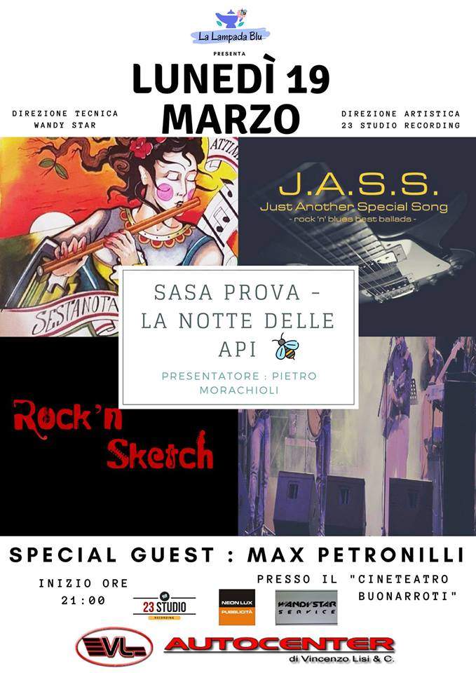 Un concerto in beneficenza in occasione della Festa del Papà. Un concerto in onore di una figura di assoluto riferimento nella musica civitavecchiese, Simone Morachioli, organizzatore di eventi e costante supporto ai gruppi emergenti locali grazie alla sua 23 Studio Recording. Simone ha recentemente perso la sua piccola Melissa, creatura appena nata tragicamente scomparsa. E a lei sarà dedicata Sasa Prova – La notte delle api, serata all’insegna della buona musica, con lo scopo di raccogliere fondi per l’associazione “La Lampada Blu”, che da tempo si occupa di attività ricreative per le persone disabili. La serata è in programma lunedì 19 marzo, presso il CineTeatro Buonarroti di Civitavecchia.