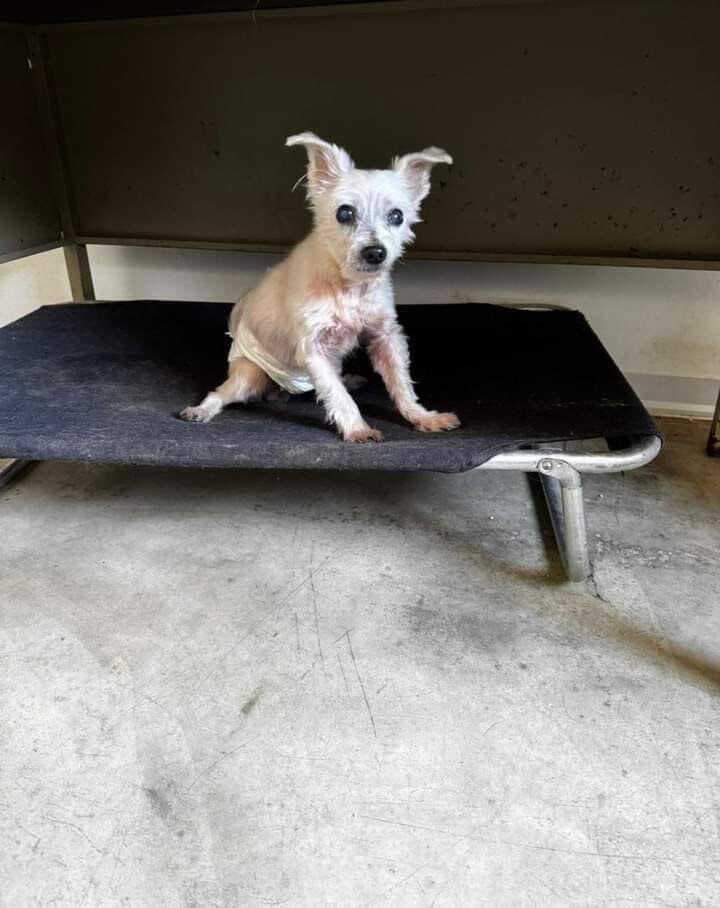 Coccolino è un maltese di 4 kg (tosato per una dermatite). Pochino sordo, un po di cataratta e porta il pannolino perché scenderlo dall’appartamento era troppo faticoso.