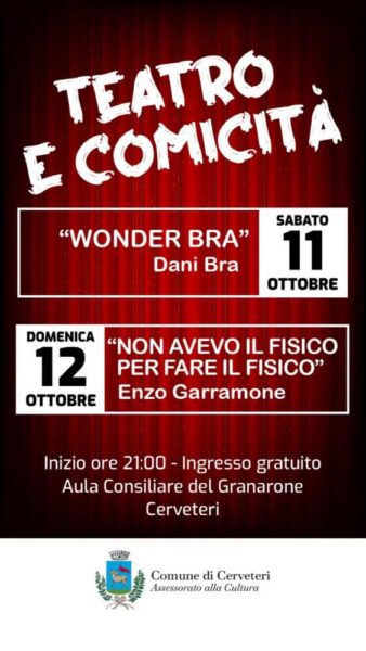 “Due serate da non perdere a Cerveteri, due spettacoli comici ad ingresso gratuito: due momenti per stare insieme e trascorrere del tempo con degli artisti davvero di spessore, che sapranno coinvolgere e divertire – ha dichiarato Francesca Cennerilli, Assessore alla Cultura del Comune di Cerveteri – si tratta dei primi appuntamenti dopo l’Estate Caerite: invito pertanto la cittadinanza e le famiglie a venire ad assistere a questo doppio appuntamento con la comicità che come Assessorato sono felice di proporre a Cerveteri”.