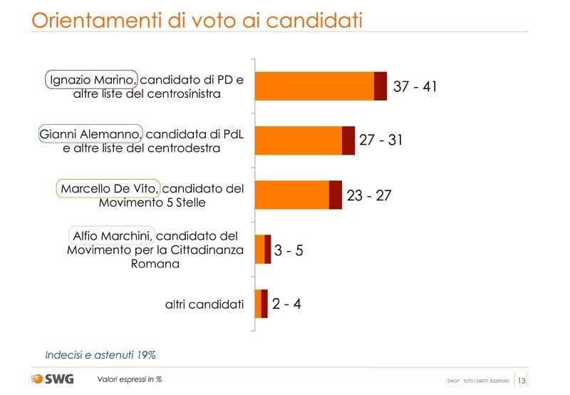 Il Pd ha invece commissionato il sondaggio all’istituto SWG. Dai dati risulta che, per l’elettorato romano, secondo il criterio di analisi della notorietà del candidato, il più noto è: Gianni Alemanno al 90% per ragioni prevedibilmente legate alla carica assunta fino a questo momento di sindaco di Roma, seguono Ignazio Marino al 70%, Alfio Marchini al 34%, il candidato 5 stelle de Vito è invece al 16%. A chi è a conoscenza dei candidati si è chiesto il gradimento dei candidati (da molta a nessuna): Marino è al 58%, Marcello de Vito 44% e Alfio Marchini al 41%.