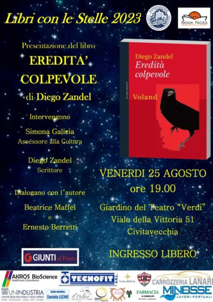 Venerdì 25 agosto alle ore 19 presso il giardino del Teatro “Verdi”, in viale della vittoria 51, si concluderà la rassegna letteraria “Libri con le Stelle”, organizzata dall’associazione culturale Book Faces e realizzata in collaborazione con la Fondazione Cariciv e grazie al sostegno di Akros Bioscience, Tecnofit srl, Civitavecchia Rugby Centumcellae, Carrozzeria Lanari, Unindustria Civitavecchia, Nausica srl, Gruppo Immobiliare Bisozzi, Palestra VIP Club, Studio dentistico Daniela Leone, Minosse srl, Farmacia San Gordiano e Ristorante Il Delfino.