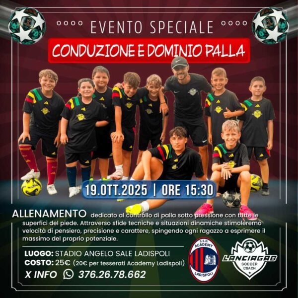 Il rettangolo verde dell’Angelo Sale di Ladispoli è infatti pronto ad ospitare la prima delle cinque masterclass in programma in questo anno sportivo 2025/2026: con un allenamento mirato, i ragazzi si eserciteranno nel controllo della palla sotto pressione con tutte le superfici del piede, attraverso sfide tecniche e situazioni dinamiche stimoleranno velocità di pensiero, precisione e carattere, spingendo ogni ragazzo a esprimere il massimo del proprio potenziale.