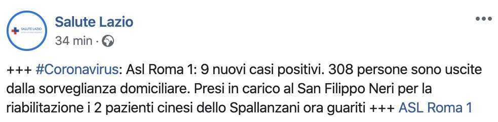 Nel dettaglio la Asl Roma 1 (zona nord ovest della città) ha evidenziato 9 nuovi casi positivi, 308 persone uscite dalla sorveglianza domiciliare. Inoltre sono stati presi in carico al San Filippo Neri per la riabilitazione i 2 pazienti cinesi in precedenza ricoverati all’Istituto Spallanzani.