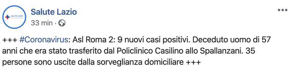 Nella Asl Roma 2 (Municipi versante sud-est) abbiamo 9 nuovi casi positivi e anche un morto: un uomo di 57 anni che era stato trasferito dal Policlinico Casilino allo Spallanzani. Trentacinque le persone uscite dalla sorveglianza domiciliare.