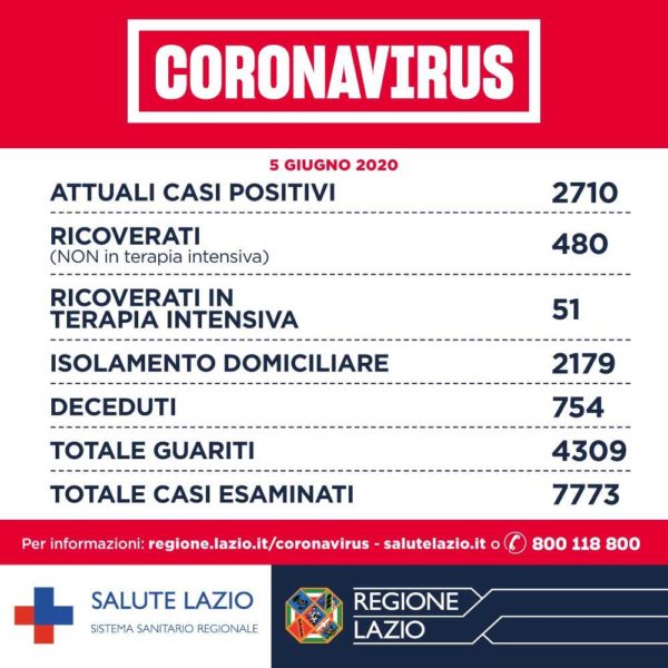 Al momento, nel Lazio, sono 2710 gli attuali casi positivi Covid19: 2179 sono in isolamento domiciliare, 480 sono sono ricoverati non in terapia intensiva, 51 sono ricoverati in terapia intensiva. Per la cronaca, 754 sono i pazienti deceduti e 4309 le persone guarite. In totale sono stati esaminati 7773 casi.