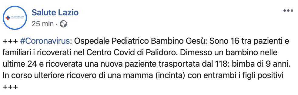È stato dimesso un bambino nelle ultime 24 e ricoverata una nuova paziente trasportata dal 118: bimba di 9 anni. In corso ulteriore ricovero di una mamma (incinta) con entrambi i figli positivi.