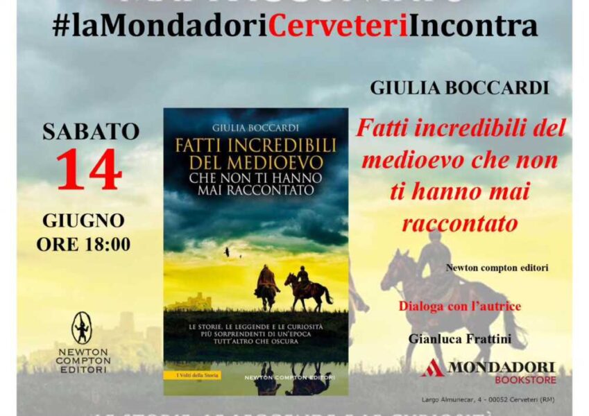 Proseguono gli appuntamenti letterari da Mondadori Bookstore a Cerveteri, la libreria di Andrea Oliva e Tarita Vecchiotti in Largo Almunecar. Domani, sabato 14 giugno alle ore 18:00 è il turno di Giulia Boccardi che accompagnerà il lettore in un viaggio nel tempo, tra aneddoti, curiosità, storie e leggende con il libro “Fatti incredibili del Medioevo che non ti hanno mai raccontato”, edito da “Newton Compton Editori”.