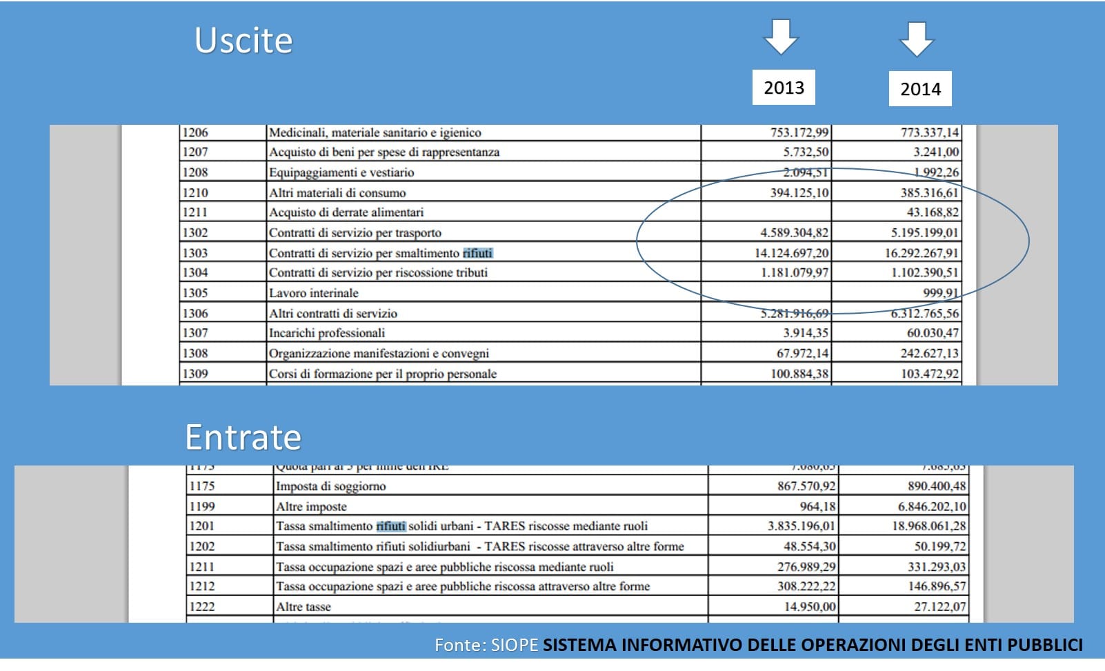 Prendiamo a riferimenti i dati economici presenti sul sistema SIOPE per gli anni 2013 e 2014: