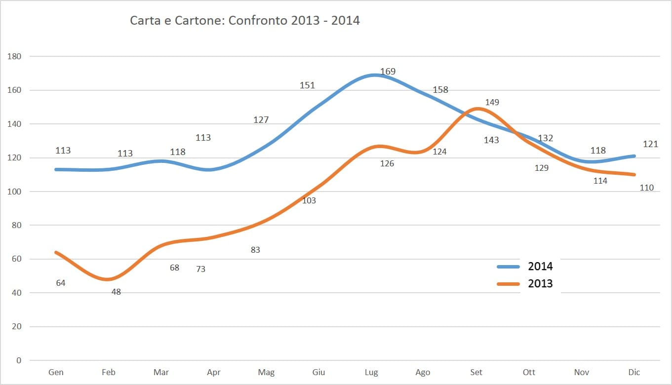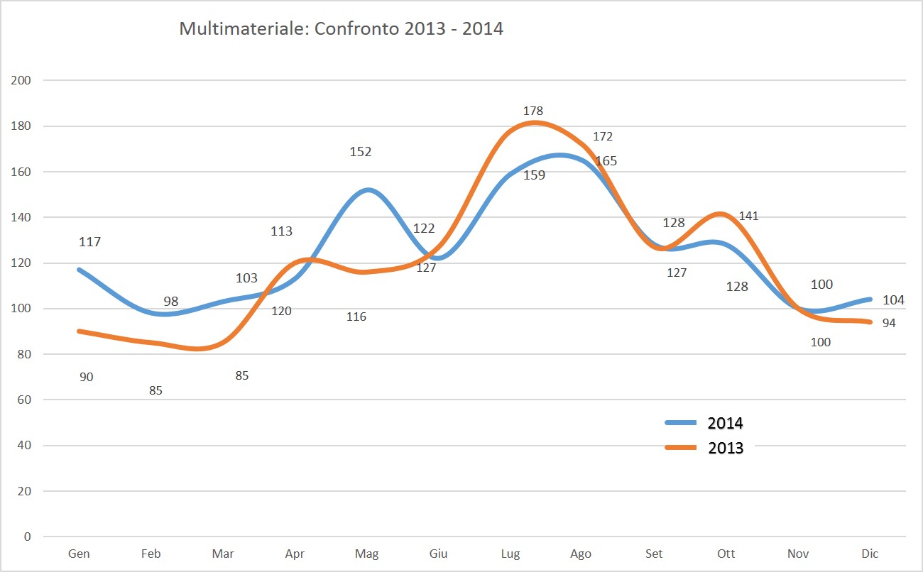 La media/mese calcolata (sugli ultimi 3 mesi di ogni anno) per il 2013 e’ di 111 tonn mentre per il 2014 e’ di 112 (+1 tonn) pari ad un incremento non significativo che andrebbe analizzato meglio avendo ulteriori dati a disposizione