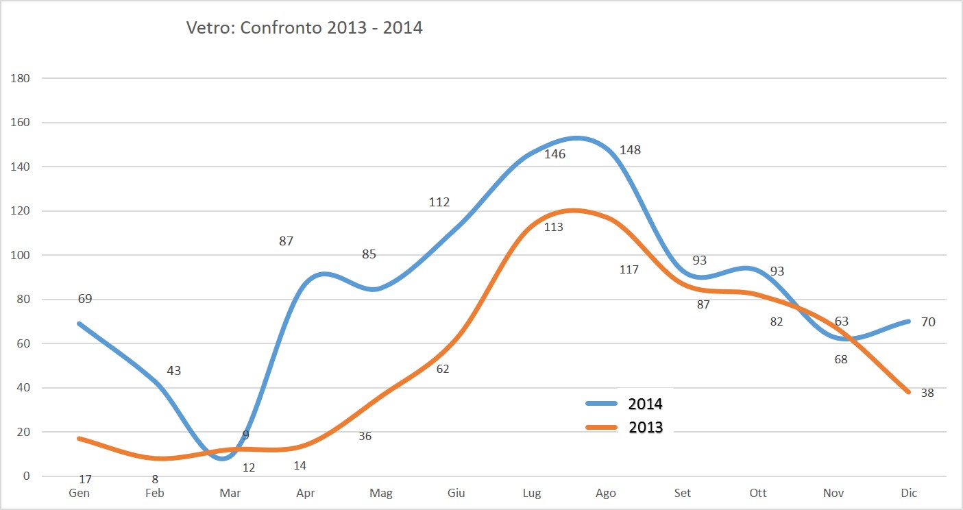 La media/mese calcolata (sugli ultimi 3 mesi di ogni anno) per il 2013 e’ di 117 tonn mentre per il 2014 e’ di 123 (+6 tonn) pari ad un incremento del 5%. La spiegazione della minor percentuale di incremento rispetto aall’organico e’ data dal fatto che buona parte dell’utenza raggiunta con il porta a porta differenziava questo materiale con la raccolta stradale.