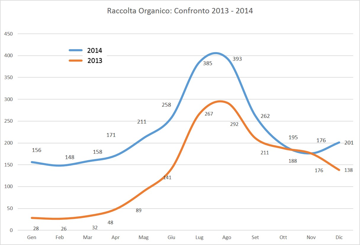 Nel grafico si notano le differenze nella produzione mensile di rifiuto organico sia in funzione della stagionalita’ e sia in funzione dell’afflusso turistico. La media/mese calcolata (sugli ultimi 3 mesi di ogni anno) per il 2013 e’ di 167 tonn mentre per il 2014 e’ di 191 (+24 tonn) pari ad un incremento del 14%.