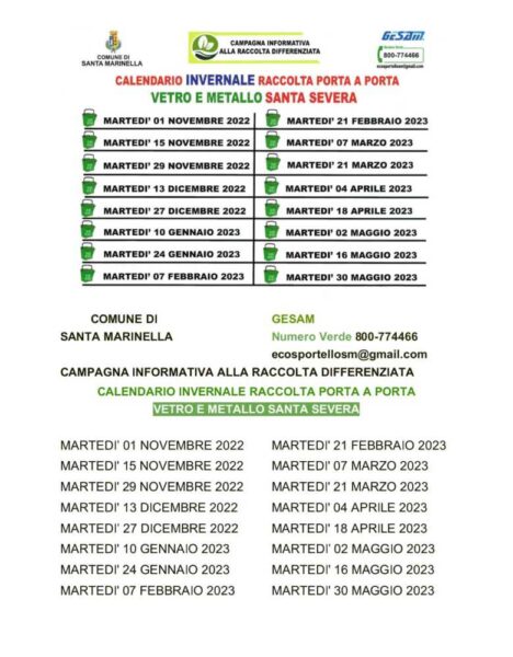 Dopo aver ritirato le campane del vetro, dislocate nelle varie zone del territorio di Santa Severa, dal 1 novembre partirà la raccolta porta a porta che si svolgerà ciascun martedì del mese con cadenza ogni 15 giorni durante la stagione invernale e settimanalmente in estate.