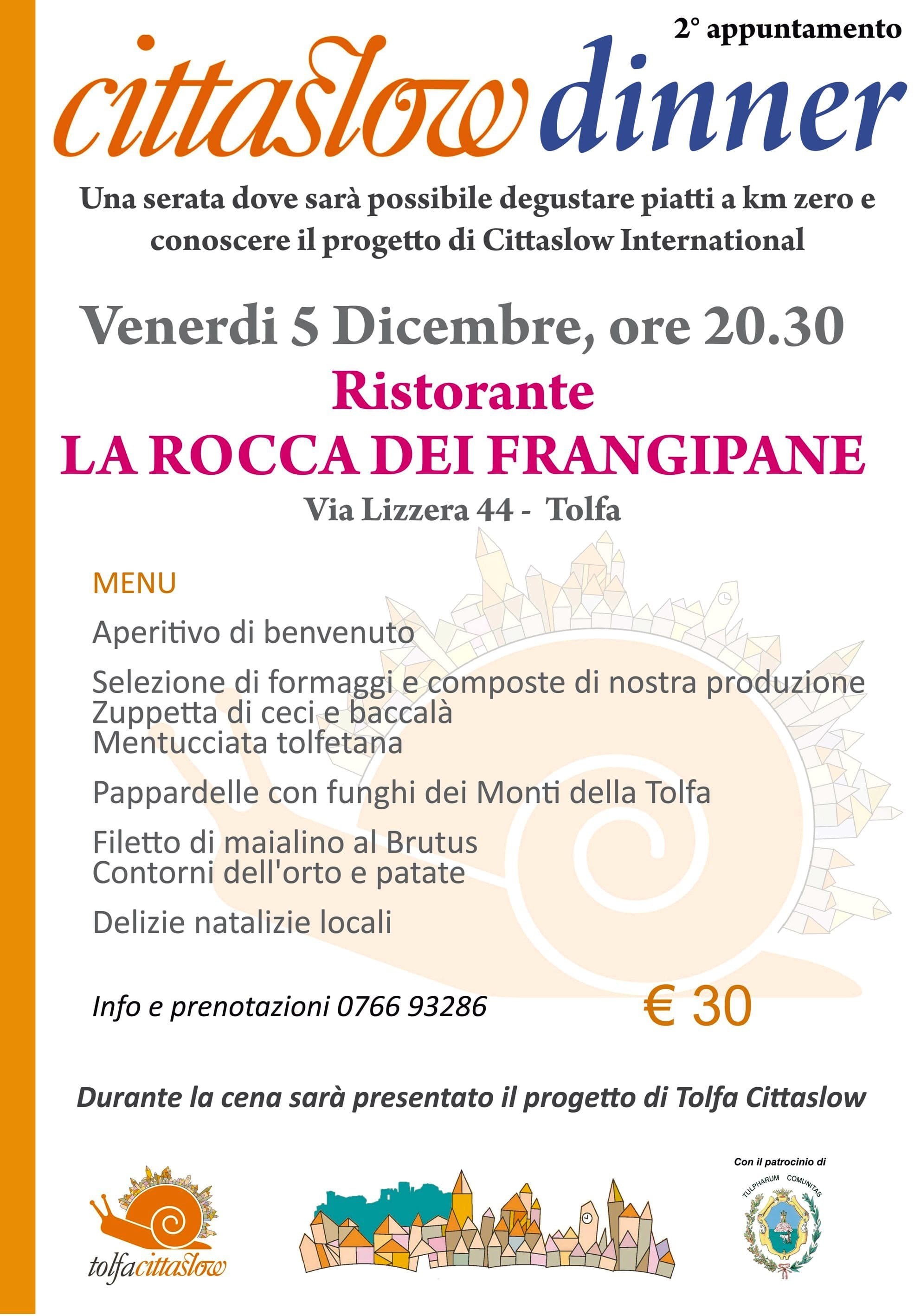La seconda tappa avrà luogo domani, venerdi 5 dicembre presso il ristorante “La Rocca dei Frangipane”, che ha una suqdra di cucina capitanata dallo Chef Mario Casci. Il menù, che avrà il prezzo di 30€, prevede 8 portate di pietanze realizzate con materie prime tolfetane, come la mentucciata o le pappardelle con i funghi dei monti della Tolfa. L’iniziativa, patrocinata dal Comune di Tolfa, vuole essere un modo per sostenere l’economia locale della ristorazione e allo stesso tempo far conoscere il percorso intrapreso nel network internazionale di Cittaslow International.