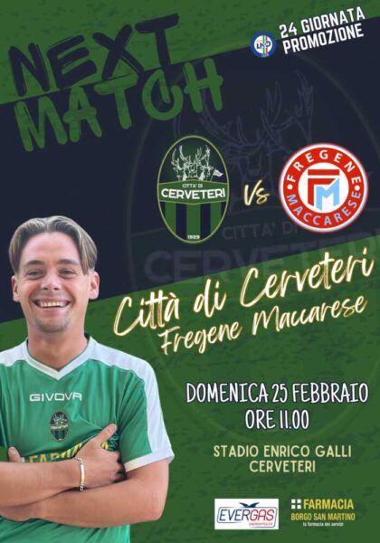 Gara fondamentale quella di domani, domenica 25 febbraio alle ore 11:00 al Campo Enrico Galli. Il Città di Cerveteri allenato dal Mister Paolo Caputo, reduce dalla sconfitta all’ultimo istante contro il Santa Marinella lanciatissimo in zona play-off, domani contro il Fregene – Maccarese ha solamente un risultato a disposizione: la vittoria.