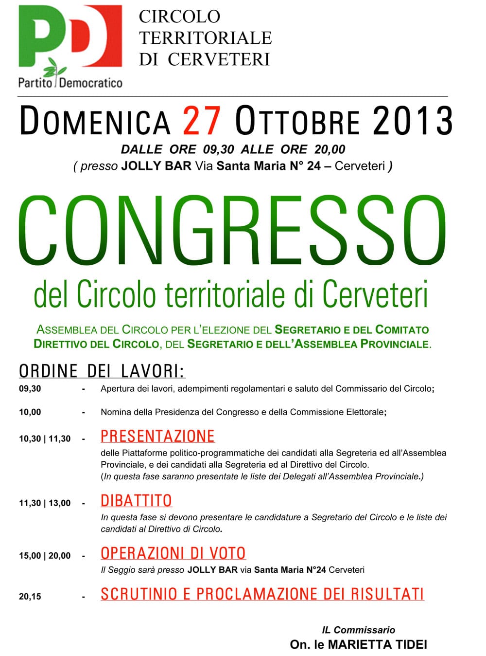 Domenica 27/10/2013, presso il JOLLY BAR di Cerveteri in Via Santa Maria N° 24, si svolgerà il CONGRESSO del nostro Circolo. Il Congresso del Partito Democratico cade, come non mai, in un momento politico decisivo per le sorti del Paese, ma anche del nostro partito. E’ il momento più alto di partecipazione nella vita democratica del Partito, siamo chiamati a scegliere la Sua Linea Politica e il Suo nuovo Segretario. Anche per questo è importante fondamentalmente la Tua partecipazione al Congresso di Sezione per la discussione delle piattaforme politiche programmatiche e l’elezione dei candidati alla Segreteria Provinciale, del Segretario e del Comitato Direttivo del Circolo. Saranno inoltre eletti i Delegati alla Convenzione Provinciale.