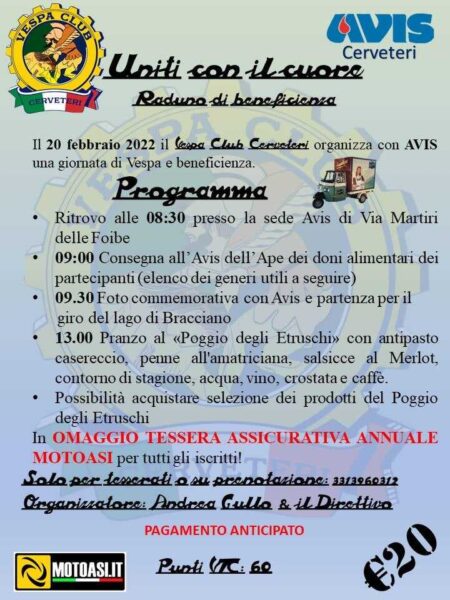 “Uniti con il cuore” è il nome della giornata, che avrà inizio alle ore 08:30 presso la sede Avis di Via Martiri delle Foibe. Alle ore 09:00 consegna all’Avis dell’Ape dei doni alimentari dei partecipanti. Alle ore 09:30 foto commemorativa tra Avis e Vespa Club e partenza poi per il lago di Bracciano.