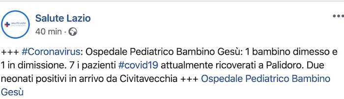 A Civitavecchia due neonati positivi: la notizia è stata diramata venerdì 3 aprile sulla pagina Facebook di Salute Lazio, il canale social dell’assessorato regionale alla Sanità. I due piccoli sono attesi all’ospedale Pediatrico Bambino Gesù.
