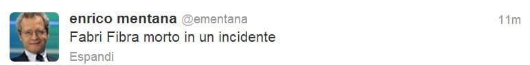 Non è un periodo fortunato per il povero Fabri Fibra. Dopo la mancata partecipazione al concerto del Primo Maggio arriva sul web la notizia della sua morte in un incidente stradale. Potrebbe sembrare uno scherzo se non fosse per il fatto che a dare la notizia è l’account twitter di Enrico Mentana.