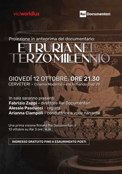“Tra gli interventi – aggiunge Pascucci – quelli di Vincenzo Bellelli, direttore del Parco Archeologico di Cerveteri e Tarquinia, Flavio Enei, Direttore del Museo del Mare e della Navigazione Antica di Santa Severa, dell’artista ceramografo Roberto Paolini, di Massimiliano Alessandrini, storico artigiano cerite e molti altri che ci racconteranno com’era l’Etruria e come è oggi. Sarà dunque anche occasione per il pubblico del nostro territorio di vedere sul grande schermo del Cinema Moderno, che ringrazio per l’ospitalità, volti e luoghi conosciuti. È una grande emozione che l’anteprima del documentario, alla presenza del Direttore di Rai Documentari Fabrizio Zappi, si tenga proprio a Cerveteri, sede del sito UNESCO. Con l’occasione, ci tengo a ringraziare tutte le Amministrazioni comunali e gli Enti del territorio che nel corso delle riprese hanno dimostrato disponibilità e attenzione, così come ringrazio tutti coloro che hanno reso possibile la realizzazione di questo documentario, dal personale tecnico alle comparse”.