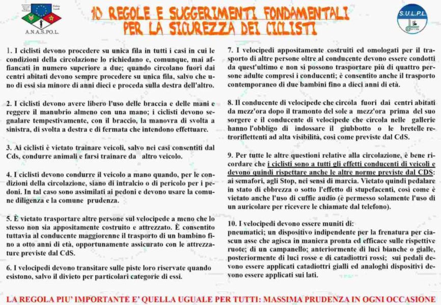 “Abbiamo cosi deciso” hanno concluso i rappresentanti di Anaspol e Sulpl “anche alla luce dei  bonus per l’acquisto delle due ruote previsti dal Governo, di scrivere 10 regole e suggerimenti per ricordare ai ciclisti meno esperti come si va in strada, per la loro e altrui sicurezza. Non manca la raccomandazione per gli automobilisti di prestare molta attenzione e prudenza soprattutto quando circolano vicini o in prossimità delle biciclette e, nel contempo, raccomandiamo i Comuni di aumentare la presenza di piste ciclabili nelle città.”