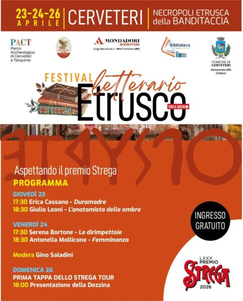 La grande letteratura torna protagonista nel cuore della storia. In occasione del fine settimana della Festa della Liberazione, la Necropoli Etrusca della Banditaccia, sito UNESCO di Cerveteri, ospiterà l’edizione 2026 del Festival Letterario Etrusco, seguita dall’attesa tappa nazionale del Premio Strega.