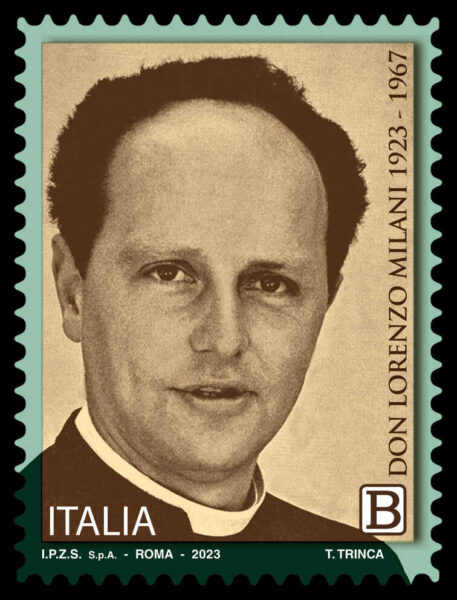Completano il francobollo la legenda “DON LORENZO MILANI”, le date”1923 – 1967”, la scritta “ITALIA” e l’indicazione tariffaria “B”.