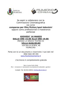 Riceviamo e pubblichiamo – La Commissione Cinematografica della Città di Fiumicino, recentemente istituita con un Protocollo d’intesa tra Comune di Fiumicino e Associazione Acis, ha organizzato per il prossimo giovedì 16 marzo un casting per aspiranti attori, comparse, professionisti e maestranze.