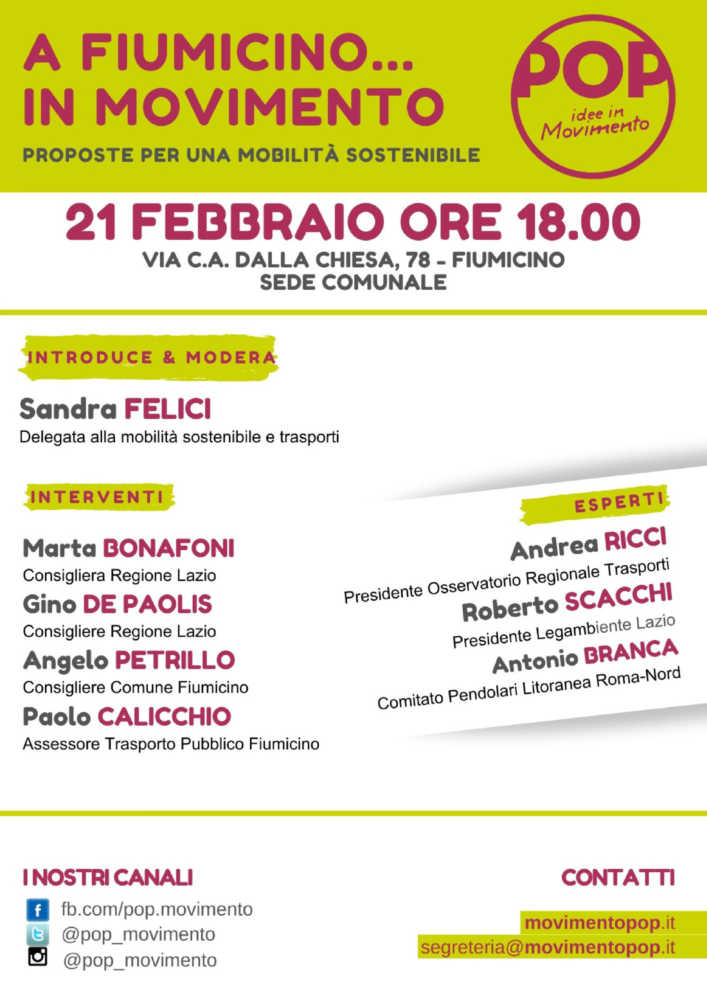 L’assemblea organizzata dall’associazione “POP idee in movimento”, sarà anche occasione per fare il punto sulla situazione in tema di mobilità di tutto il territorio alla presenza della consigliera regionale Marta Bonafoni, dell’assessore ai trasporti del Comune di Fiumicino Paolo Calicchio, della delegata del Sindaco di Fiumicino alla mobilità sostenibile e trasporti, Sandra Felici; del consigliere regionale Gino De Paolis e del consigliere comunale di Fiumicino, Angelo Petrillo. Saranno presenti Andrea Ricci, Presidente dell’Osservatorio Regionale sui Trasporti (Fiumicino sud: progetto per tornare in RETE), Antonio Branca, Comitato pendolari litoranea Roma-Nord (Vita da pendolare, problemi e soluzioni).
