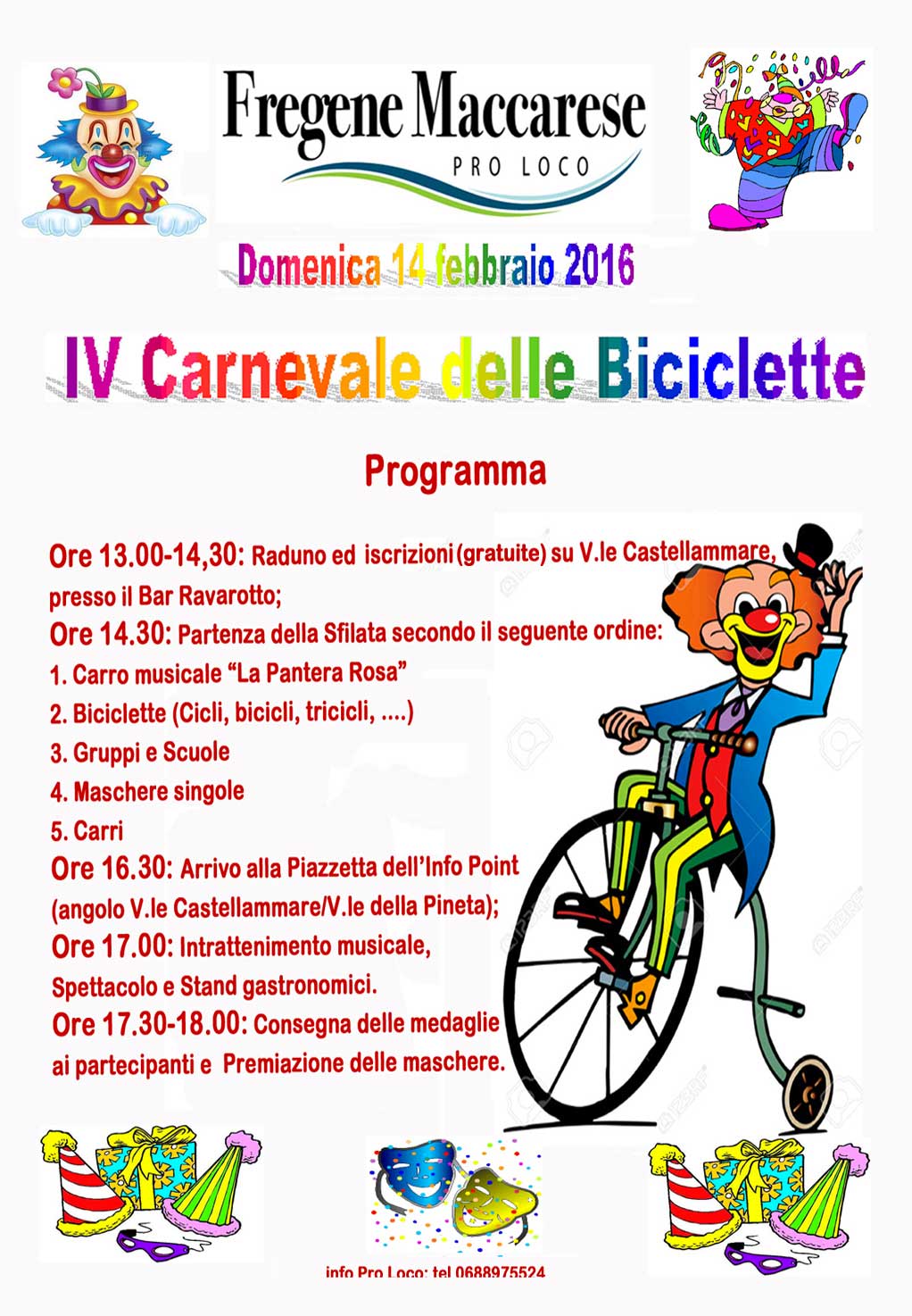 La Pro Loco di Fregene e Maccarese, per venire incontro alle esigenze espresse da numerosi cittadini ed esercenti, ha fissato per il pomeriggio di Domenica 14 Febbraio p.v. lo svolgimento della tradizionale sfilata dei carri, delle biciclette, dei gruppi mascherati e delle singole maschere, di cui si allega il Programma dettagliato.