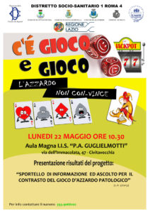 Riceviamo e pubblichiamo – Si terrà il prossimo 22 maggio alle ore 10.30 presso l’istituto superiore Guglielmotti un incontro, patrocinato dalla Camera dei Deputati, in cui verranno presentati gli apprezzabili risultati dello “Sportello di informazione e ascolto per il contrasto del gioco d’azzardo patologico” svolto dal Distretto 1 Roma 4, e gestito dall’Associazione “Il Ponte – Centro di Solidarietà” Onlus in rete con i servizi territoriali della Asl, nell’ambito del Progetto regionale “Lazio in Gioco”.