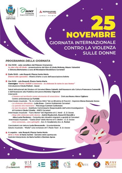 “La Giornata Internazionale per l’Eliminazione della Violenza contro le Donne è sempre un momento estremamente sentito e toccante all’interno della nostra comunità – ha dichiarato Francesca Cennerilli, Assessore alla Cultura del Comune di Cerveteri – lo dimostra la forte adesione da parte di realtà associative che hanno scelto di essere presenti e di contribuire in maniera attiva al programma delle iniziative, con momenti di informazione, sensibilizzazione, arte e cultura. Una Giornata che da Donna e rappresentante delle Istituzioni sogno un giorno non ci sia più bisogno di organizzare eventi come questo: per far sì che ciò accada, c’è bisogno di un cambiamento radicale delle nostre società, che parta dal basso, che inizi dalle nuove generazioni alle quali è fondamentale trasmettere la cultura del rispetto, della non violenza, della pace e della giustizia. Come Amministrazione, cerchiamo di dare il nostro piccolo contributo, sperando che iniziative come questa possano tenere sempre alta l’attenzione e possano aiutare a sensibilizzare, per avere presto un mondo libero dalla violenza di genere e da ogni forma di violenza”.