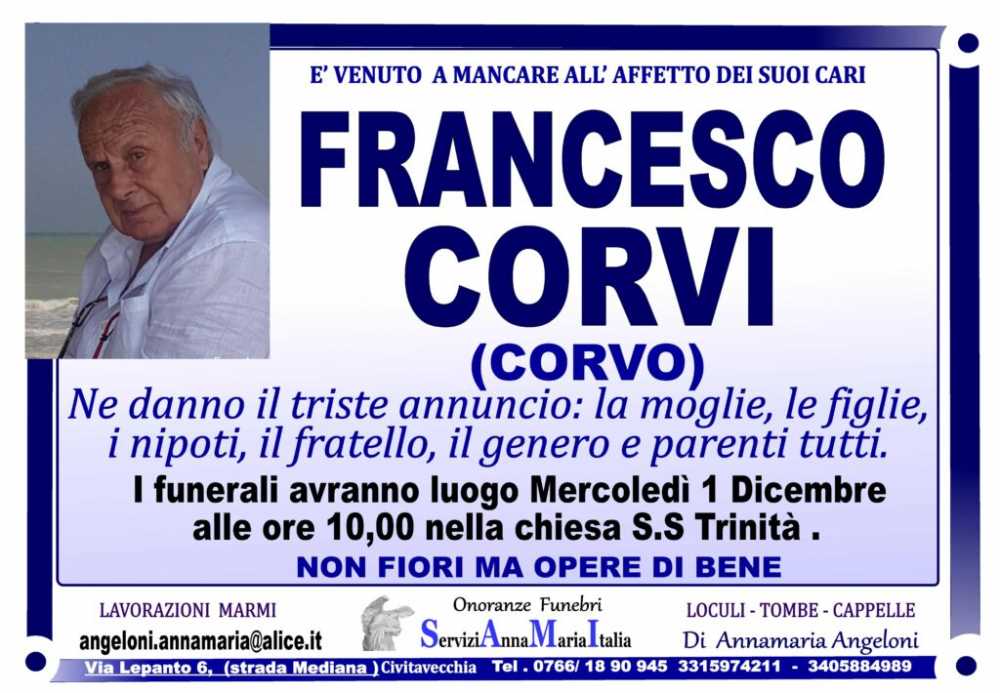 Le famiglie Corvi e Guainella ringraziano sentitamente gli operatori dell’hospice oncologico Carlo Chenis per le cure prestate a Francesco Corvi, nei giorni della malattia trascorsi nella struttura della Braccianese Claudia.