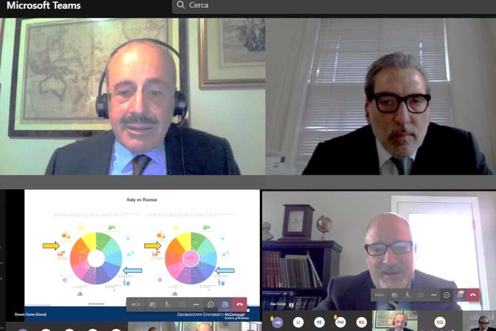 L’avvocato Ugo Colella dello studio legale Colella & Zefutie LLC di Washington D.C., il Professor Dennis Quinn – Vice-rettore della Georgetown University, McDonough School of Business, e docente di International Business presso la stessa università e l’Avvocato Alan T. Dickey di Washington DC, già membro del corpo dei Marines statunitensi hanno fornito all’audience il loro contributo qualificato, assistito da argomentazioni originali e documentate.