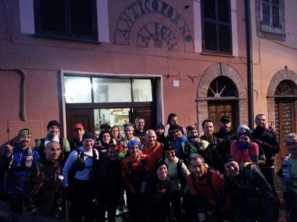 Rio Fiume al km 40 e la lunga salita a Monte Tolfaccia al km 46 in uno scenario dai suoi 500 m di fronte al mare e con un tramonto strepitoso aveva oramai ammutolito tutti. Poi ancora a seguire Le strade Medievali dei colli delle Spiagge, e infine Tolfa. In un sospirato e trionfale arrivo sotto gli occhi di chi nulla sapeva e l’arrivo in piazza del Comune di Tolfa. Sporchi di fango e segnati non solo nello spirito, conquistavamo la piazza del Comune.