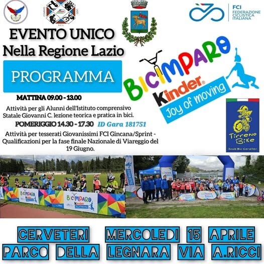 Un evento unico dedicato ai ragazzi e alla bicicletta: a realizzarlo, la Tirreno Bike di Cristiano D’Annunzio, che domani, mercoledì 15 aprile per l’intera giornata è pronta ad “invadere” il Parco della Legnara con i bambini dell’Istituto Comprensivo Giovanni Cena al mattino e con tantissimi atleti nel pomeriggio, che gareggeranno per qualificarsi alla fase finale di Viareggio fissata per il giugno prossimo. L’evento, è patrocinato dall’Assessorato allo Sport del Comune di Cerveteri.