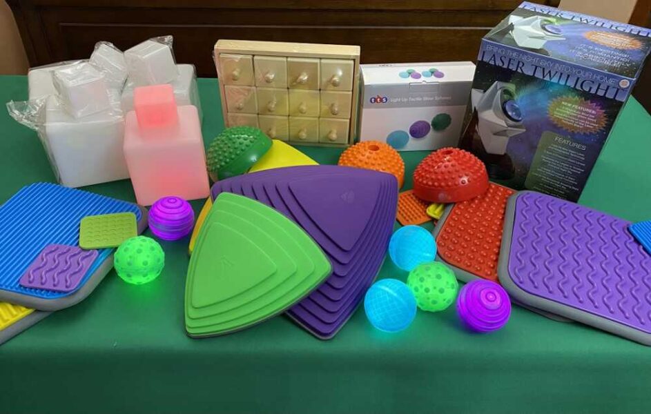 Oltre ai due pannelli per attività sensoriale in stile Montessori, già consegnati in occasione del concorso “Un poster per la pace”, il Lions Club Tarquinia ha messo a disposizione percorsi sensoriali composti da piastrelle e “riverstones” che stimolano la percezione tattile, ricci di equilibrio, cubi luminosi che cambiano colore, sfere tattili luminose, cubi sonori e un proiettore laser per riprodurre un cielo stellato e i pianeti.