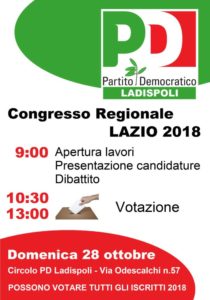 Ci vediamo pertanto domenica 28 ottobre 2018 presso il Circolo PD Ladispoli di Via Odescalchi n.57, dalle ore 9 per l’apertura dei lavori, la presentazione delle mozioni congressuali e sino alle ore 13 per le votazioni. Possono votare i nuovi iscritti fino al 7 ottobre e tutti quelli che abbiano rinnovato la tessera fino al giorno della convenzione (è possibile rinnovare anche domenica 28 ottobre)”.