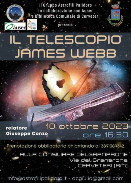 Martedì 10 ottobre alle ore 16:30, in collaborazione con il personale della Biblioteca comunale e il Gruppo Astrofili di Palidoro, si terrà la conferenza “Il Telescopio James Webb”, che vedrà come relatore Giuseppe Conzo.