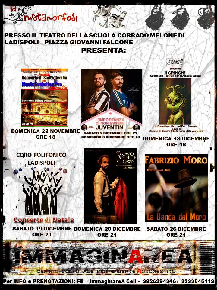 Domenica 13 dicembre, pomeriggio dedicato ai bambini e al Natale, con il gruppo S’Agapo Arte che presenterà uno spettacolo dal titolo “Il Grinch”!, tratto dall’omonimo libro del Dott. Seusse, a cura di Gaetano De Gennaro, Roberta Segna e Sila Mastroianni. Sabato 19 dicembre spazio ai canti classici natalizi con il concerto del Coro Polifonico di Ladispoli, mentre domenica 20 dicembre il talentuoso Luca Morelli porterà sul palco di ImmaginArea il suo spettacolo dal titolo “Bravo pour le clown”. Racconto emozionato di un teatro vuoto, l’omaggio di una maschera. Tra oggetti polverosi, vecchi vinili e pellicole cinematografiche si svilupperà il racconto di una sala teatrale prossima alla chiusura per fare spazio ad un centro commerciale, ma l’ultimo monologo sarà davanti ad una platea vuota. Poesia quindi, ma anche una tematica quanto mai attuale a Ladispoli dopo le vicende legate al Campo Sportivo. Sabato 26, infine, spazio al rock nostrano con La Banda del Moro, prima cover band italiana di Fabrizio Moro, che presenterà un concerto in cui ripercorrerà tutte le più belle canzoni del cantautore romano emerso alla ribalta del grande pubblico col brano contro la mafia, Pensa!