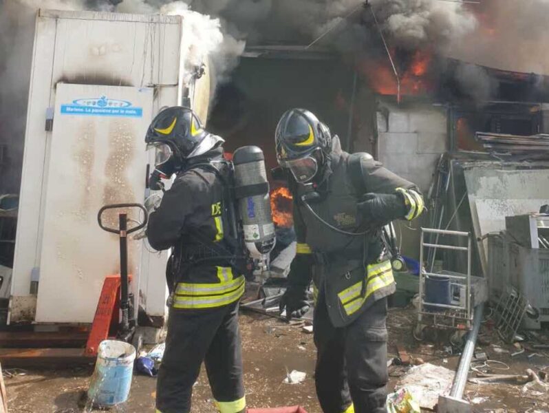 Fiamme nelle vicinanze delle abitazioni. Il personale dei pompieri sta cercando di controllare le lingue di fuoco, per evitare che raggiungano le case adiacenti. Le persone sono state fatte allontanare dagli edifici per sicurezza. Il capannone, date le alte temperature raggiunte, rischia di crollare.