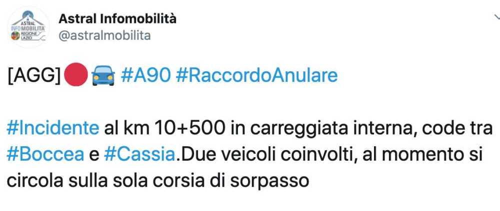 È stato predisposto il restringimento di carreggiata a causa del sinistro in carreggiata interna tra le uscite Cassia e Casal del Marmo, al chilometro 10,500, in prossimità della galleria “Trionfale”.