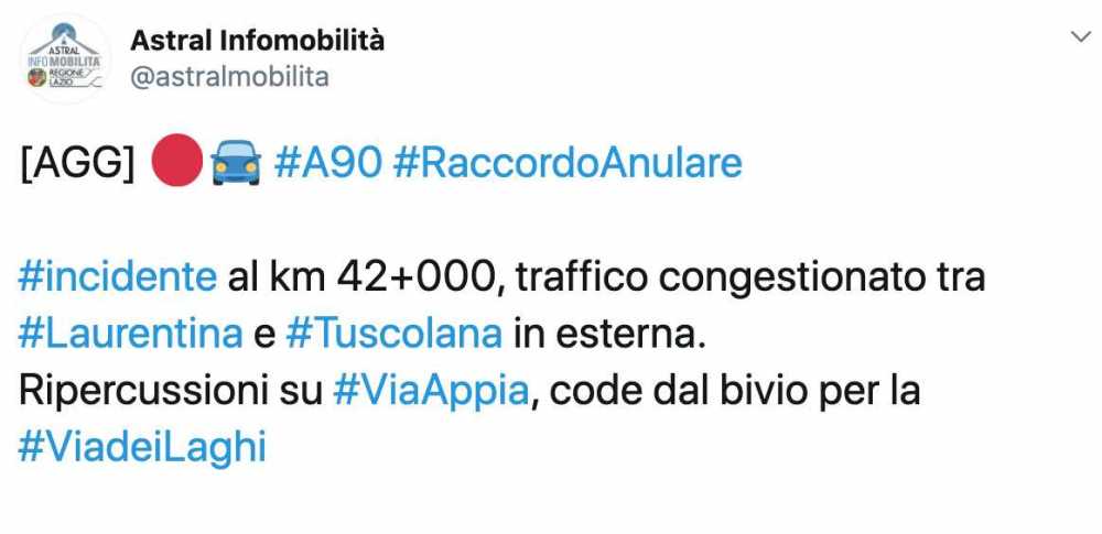 Incidente sul Raccordo Anulare. A causa del sinistro – che ha coinvolto più veicoli – sono temporaneamente chiuse al transito la corsia di sorpasso e quella centrale del GRA, al chilometro 42 all’altezza dell’uscita “Tuscolana” in carreggiata esterna. L’episodio è avvenuto nella mattinata di giovedì 23 luglio.