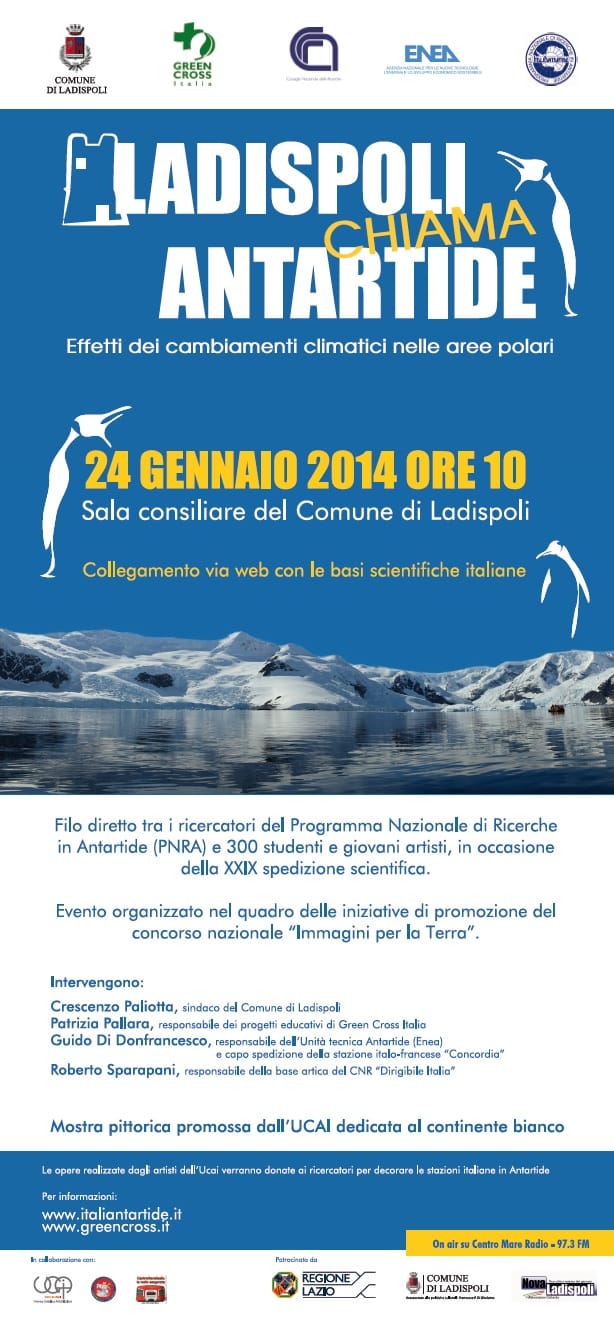 L’incontro si svolgerà nella sala consiliare del Comune di Ladispoli e vedrà, dopo il saluto del sindaco Crescenzo Paliotta, gli interventi dei ricercatori Guido Di Donfrancesco (responsabile protezione ambientale Enea – Unità tecnica Antartide) e Roberto Sparapani (responsabile della base artica del Cnr “Dirigibile Italia”), che spiegheranno ai ragazzi quanto sia importante studiare le aree polari per comprendere i cambiamenti climatici.