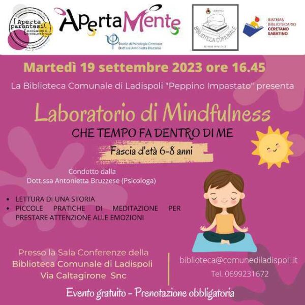 L’amministrazione comunale di Ladispoli informa che la Biblioteca nel mese di settembre inaugura un ciclo di appuntamenti, rivolti a bambini ed adulti, di introduzione e conoscenza della Mindfulness, che significa letteralmente “piena consapevolezza di sé prestando attenzione alla realtà nel momento presente, in maniera oggettiva e distaccata e, soprattutto, non giudicante”.