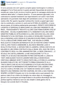 Ma che il Sig. Esigibili abbia sprezzo e poca contezza di dove sia il limite tra legalità e reato, tra pubblico e privato lo si evince chiaramente nel post. Ne è riprova il vano tentativo di affogare le irregolarità notevoli che gli sono state imputate dalla Procura della Repubblica, dal Comune di Ladispoli, dalla Guardia di Finanza con il suo ruolo di amministratore locale. Il Sig. Esigibili, che come dice ha svolto numerosi incarichi nella pubblica amministrazione giustamente e lautamente pagati con i soldi di noi cittadini, si addossa addirittura il merito di aver dotato il territorio di pronto soccorso ed ospedali, dimenticando che i soldi che ha gestito sono soldi pubblici e non soldi di Santino Esigibili. Sulla loro corretta ed efficiente gestione lasciamo poi ai posteri l’ardua sentenza. Altro passaggio singolare riguarda invece le persone aiutate dall’alto del suo ruolo di segretario della Democrazia Cristiana, passaggio che evocherebbe pratiche poco trasparenti in quanto in uno stato di diritto tutti i cittadini dovrebbero avere stessi diritti e questi gli dovrebbero essere riconosciuti al di là degli aiutini politici.