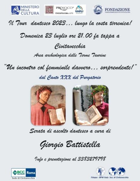 Tra le 26 tappe del percorso, è prevista per domenica 23 luglio la sosta a Civitavecchia grazie all’ospitalità della Pro Loco cittadina e della Sezione Fidapa di Civitavecchia con il patrocinio della Fondazione Ca.Ri.Civ. e della BCC Roma Agenzia di Civitavecchia.