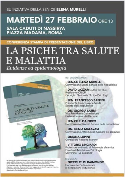 Di questo e molto altro, se ne parla nel libro scritto da David Lazzari “La psiche tra salute e malattia – Evidenze ed epidemiologia”, che nella giornata di martedì 27 febbraio alle ore 13:00 sarà presentato nella cornice della Sala Nassirya a Palazzo Madama.